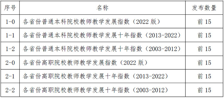 此次发布的2022版指数,数据采集起始于1989年,包括“全国本科院校教师教学发展指数”和“全国高职院校教师教学发展指数”兄弟榜。其中,本科院校教师教学发展指数包含13个指数清单(见表1),高职院校教师教学发展指数包含10个指数清单(见表2)。同时发布各省份普通高校教师教学发展指数,同样分为本科院校和高职院校两大类(见表3)。