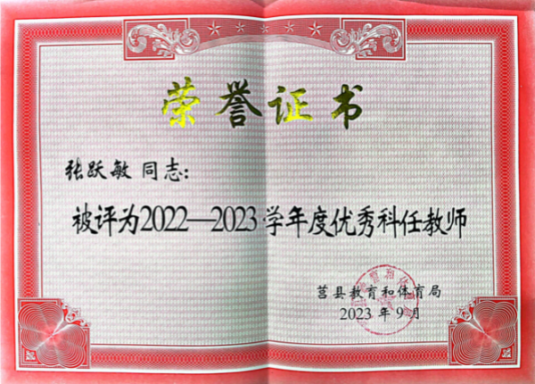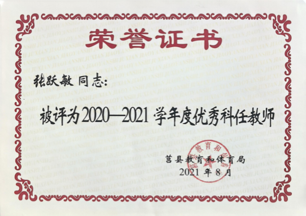 2020年,张跃敏同志被学校党委授予“优秀工程党员”的荣誉称号;2021年被莒县教育和体育局评为优秀科任教师;2023年被莒县教育和体育局评为年度优秀科任教师;2024年在全市中等职业学校教学能力比赛中荣获二等奖,在山东省职业院校教学能力大赛中获得三等奖。