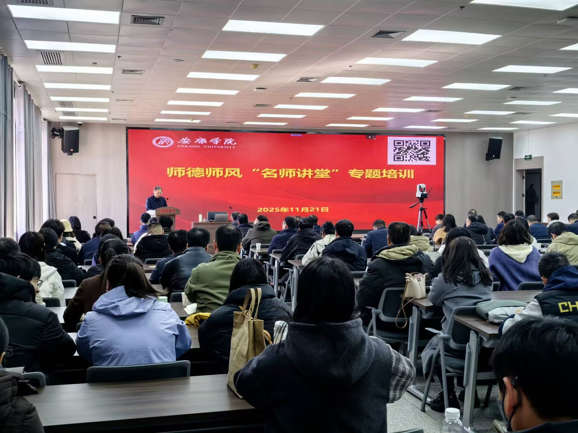 11月21日,我校在江南校区成功举办师德师风“名师讲堂”活动。本次活动特邀延安大学田伏虎教授作题为《加强师德师风建设,塑造“四有”好老师》的专题讲座。安康职业技术学院2025年新入职教师、我校近三年新进教师、副处级以上领导干部参会学习。活动由教师工作部部长汪义瑞主持。