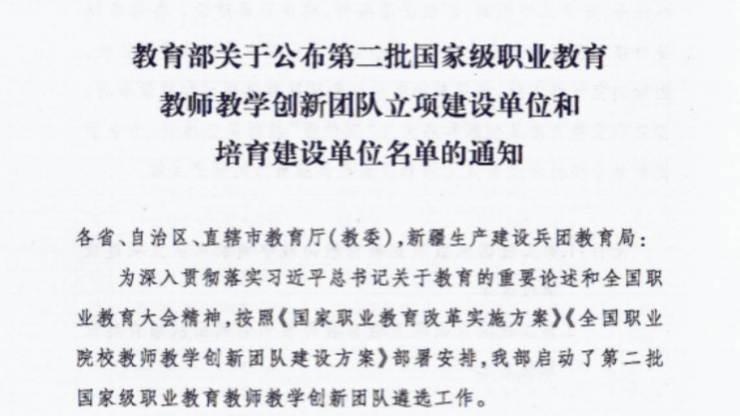 喜报:我校入选第二批国家级职业教育教师教学创新团队立项建设单位广西建院8月15日讯(城交系 林艳)近日,教育部公布第二批国家级职业教育教师教学创新团队立项建设单位名单,我校申报的市政工程技术专业团队成功入选。这是我校继建筑工程技术专业团队入选首批国家级创新团队之后,再次获批的一个国家级建设项目。据悉,此次全国共有240个团队获批立项建设,其中广西入选11个。全区仅有3所院校在教育部组织遴选的两批国家级创新团队中同时获得立项,我校为其中之一,充分展现了我校作为全国“双高”计划建设单位在推进职业教育改革创新,深化优质内涵建设方面取得的良好成效。>