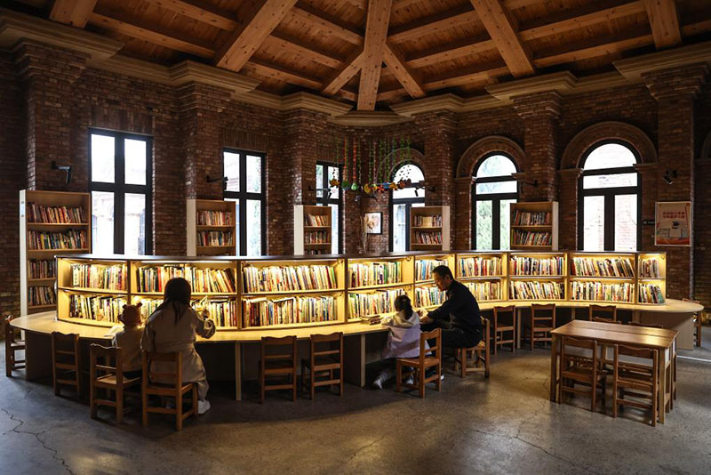 4月17日,小朋友在家长的陪同下在沈阳市铁西区奉天工场文创园内的城市书房内读书。(新华社记者 潘昱龙/摄)