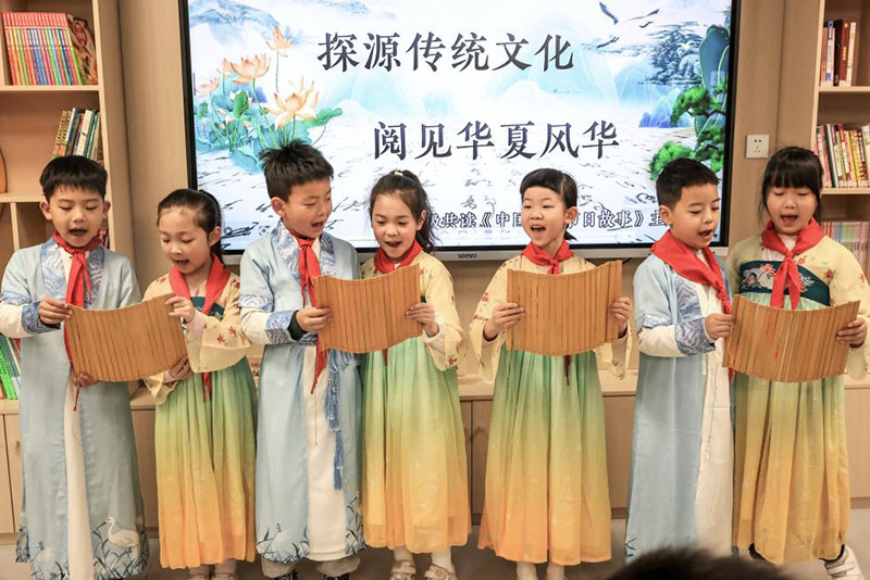 4月2日,湖北省武汉市洪山区未来实验小学美林校区学生在吟诵古诗。(新华社发 赵军/摄)