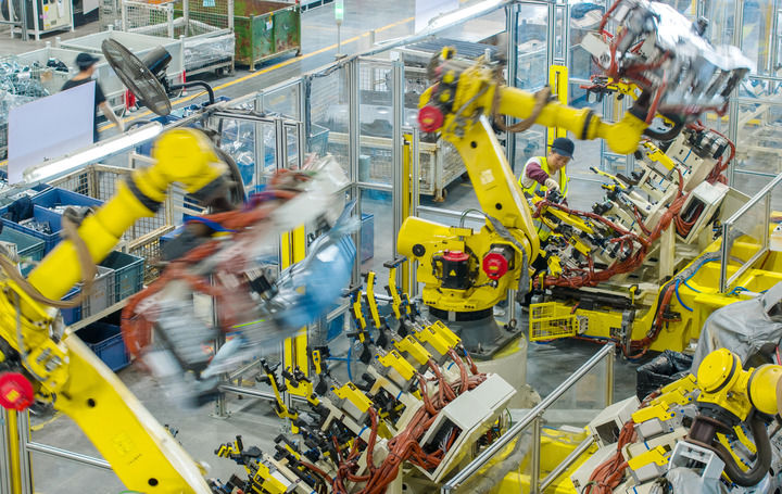 2025年10月9日,浙江省湖州市长兴经济技术开发区的长兴地通汽车部件有限公司技术人员操控工业机器人生产新能源汽车配件(无人机照片)。(新华社发 谭云俸/摄)
