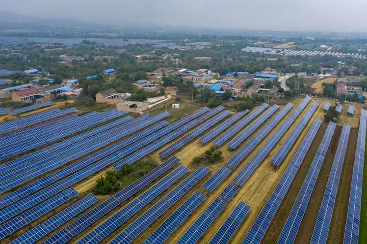 2025年6月25日在山西省运城市芮城县夭上村拍摄的光伏基地(无人机照片)。(新华社记者 杨晨光/摄)