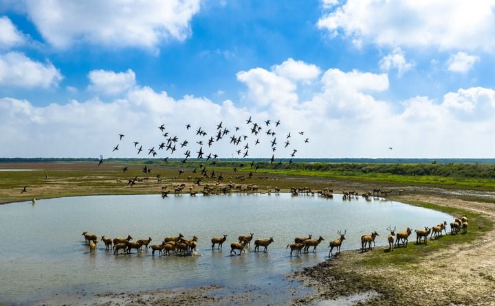 2025年10月11日,在江苏东台条子泥湿地,候鸟飞翔,成群野生麋鹿悠闲散步,一派人与自然和谐共生的生态美景(无人机照片)。(新华社发 孙家录/摄)