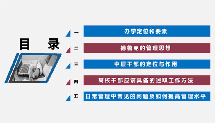 高职院校在国家大力发展培养人力资源过程中起到了关键的作用,而高职院校的办学质量也离不开人力资源的培养,中层管理者在高职院校发展中起到了十分重要的作用。本课程中,主讲人围绕办学定位、日常管理水平提升、领导干部基本功、做合格的领导干部等十个方面进行了详细介绍。
