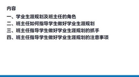 班主任是学生学业生涯规划的领路人、指导者、参与者,对于学生的学业生涯规划至关重要。本课程中,主讲人首先从学生学业生涯规划的概念入手,指出班主任在学生学业生涯规划中扮演着“万能人”的重要角色;然后从指导学生确定学业生涯目标、进行自我评价、确定行动方案等方面具体讲述了班主任应该如何指导学生进行学业生涯规划;最后指明班主任应该以班会、第二课堂、校本课程等途径作为重要抓手,从做好四个兼顾、三个协调方面做好学生学业生涯规划的指导工作。
