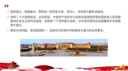 二十大报告中的涉台部分高屋建瓴、全面系统、富有新意,科学地回答了在新时代、新征程中如何推进祖国统一大业的关键性问题,是未来一个时期对台工作的根本遵循和行动指南。本课程以二十大报告中的涉台部分为主题,首先提出新时代党解决台湾问题的总体方略是做好新时代对台工作的根本遵循和行动纲领;其次指出要强化“软的一手”,下大力气推动两岸关系和平发展、融合发展,做足和平统一大文章,并且要加大“硬的一手”力度,坚决开展反分裂、反干涉斗争,为统一提供根本保障;最后强调统一大势不可阻挡,我们要奋力推进统一进程。